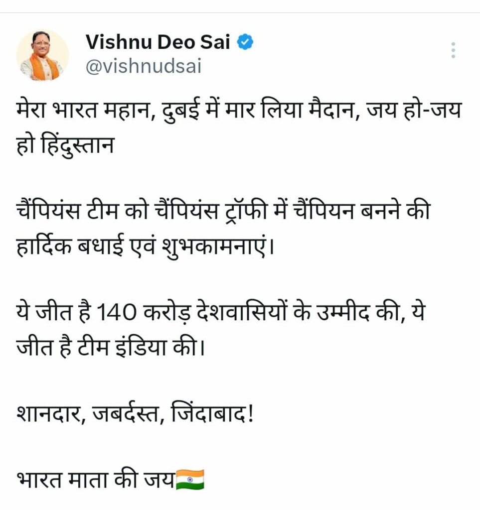 चैंपियंस ट्रॉफी में भारत की जीत पर छत्तीसगढ़ के CM विष्णु देव साय ने टीम इंडिया को बधाई दी है। सीएम ट्वीट पर कहा कि मेरा भारत महान, दुबई में मार लिया मैदान। ये जीत 140 करोड़ देशवासियों के उम्मीद की है, शानदार,जबरदस्त,जिंदाबाद, भारत माता की जय।