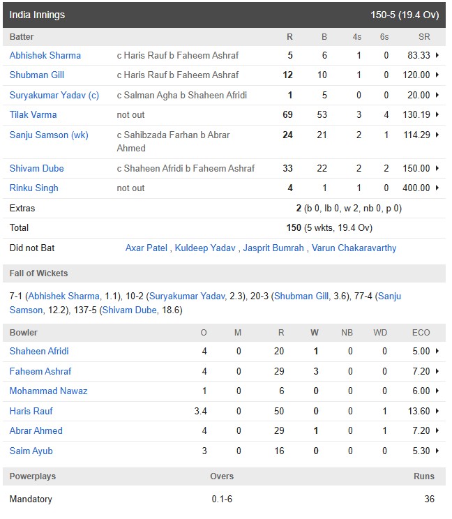इसके पहले तिलक वर्मा ने 41 गेंद में अर्धशतक जड़ा है। इस दौरान उनके बल्ले से 3 चौके और 3 छक्के निकले। संजू सैमसन बड़ा शॉट खेलने के प्रयास में कैच आउट हो गए। वह 21 गेंद में 24 रन बनाकर पवेलियन लौटे। सैमसन को अबरार अहमद ने आउट किया। 77 रनों पर भारत ने चौथा विकेट गंवाया था।