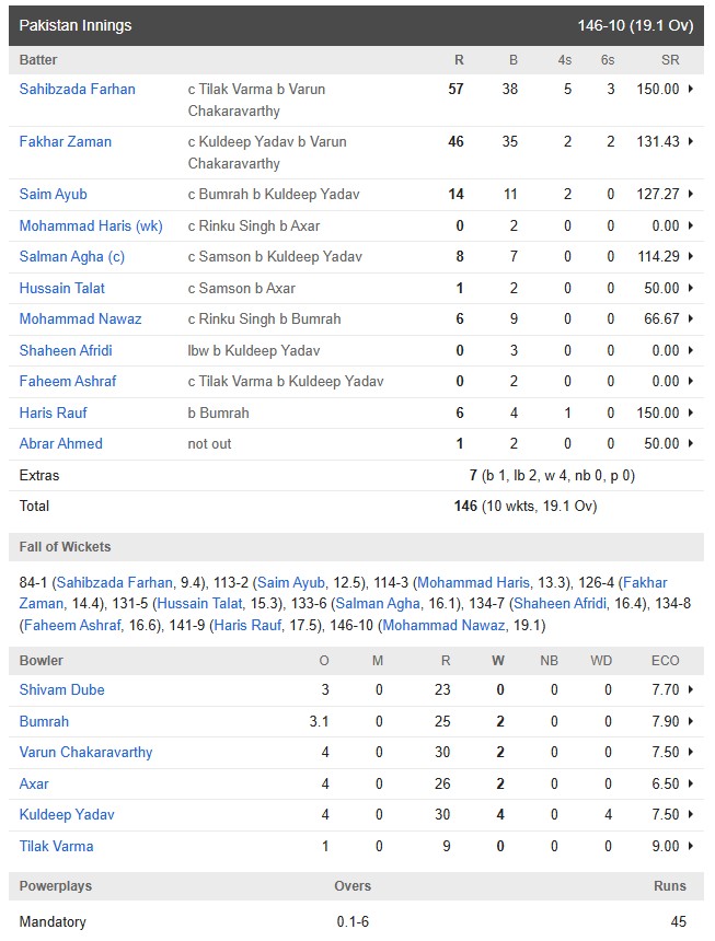 एशिया कप के खिताबी मैच में पाकिस्तान की टीम 19.1 ओवर में 146 रनों पर ढेर हो गई। एक समय पाकिस्तान का स्कोर बिना किसी विकेट के 84 रन था, लेकिन इसके बाद भारतीय गेंदबाजों ने दमदार वापसी की और 62 रनों पर अंतराल पर सभी 10 पाक बल्लेबाजों को आउट कर दिया। पाकिस्तान के लिए साहिबजादा फरहान ने 57 और फखर जमान ने 46 रन बनाए। भारत के लिए स्पिनर्स ने 8 विकेट झटके। कुलदीप यादव ने 4, वरुण चक्रवर्ती ने 2, अक्षर पटेल ने 2 और जसप्रीत बुमराह ने 2 पाक बल्लेबाजों को आउट किया।