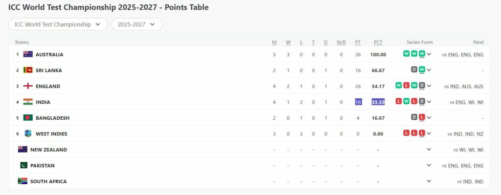 WTC Points Table 2025 || Image- ESPN cricinfo