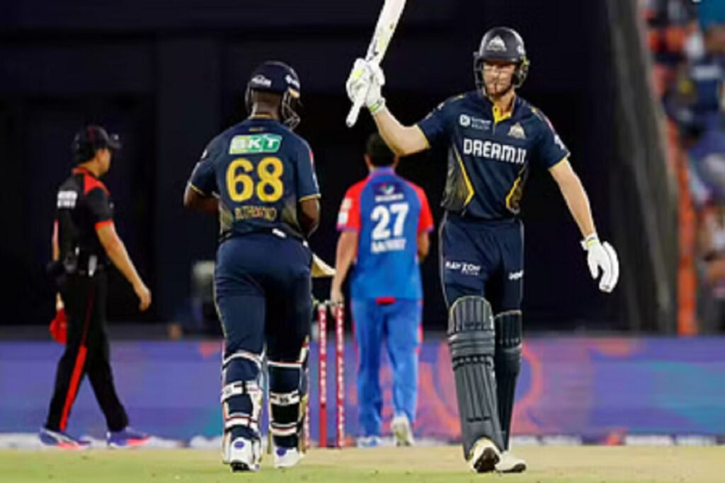 गुजरात टाइटन्स के कप्तान शुभमन गिल (07) पांच गेंद खेलने के बाद एक रन लेने को लेकर हुई गफलत में रन आउट हो गए। इससे टीम ने पहला विकेट 14 रन पर गंवा दिया। साई सुदर्शन (36 रन, 21 गेंद) और बटलर अच्छी लय में थे और दूसरे विकेट के लिए 35 गेंद में 60 रन की साझेदारी निभा चुके थे। सुदर्शन (पांच चौके, एक छक्का) कुलदीप यादव के पहले ओवर की तीसरी गेंद को पुल करने के प्रयास में सीधे डीप मिडविकेट पर उठाकर स्टब्स के हाथों कैच आउट हो गए। इस ओवर में दो रन बने और एक विकेट गिरा। फिर रदरफोर्ड ने धीमी शुरूआत के बावजूद 12वें ओवर में कुलदीप की ओवर पिच गेंद पर लांग ऑफ में छक्का जड़ा। मोहित शर्मा के पहले ही ओवर की पहली दो गेंद को रदरफोर्ड ने स्कायर और फाइन लेग पर गगनदायी छक्कों के लिए पहुंचाकर दर्शकों का उत्साह बढ़ाया। बटलर ने चौका जड़कर इसी ओवर में अपना 32 गेंद में तीन चौके और तीन छक्के की मदद से अर्धशतक पूरा किया। मोहित के इस ओवर में 18 रन बने।