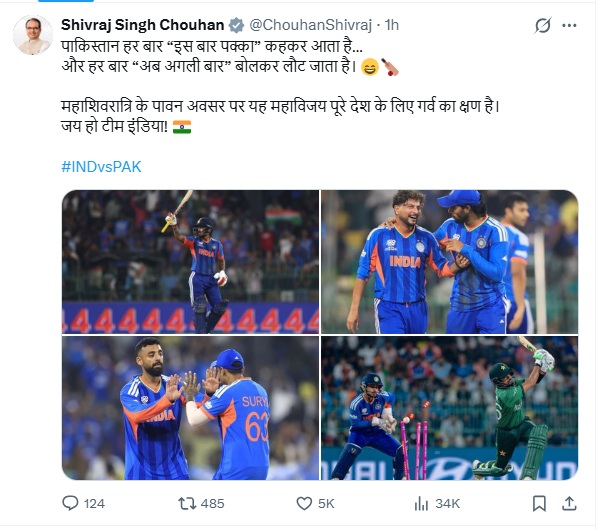 फ़ॉर्मेट, जगह और तारीखें बदल सकती हैं, लेकिन #IndvsPak का नतीजा एक जैसा रहता है। पूरी टीम को बधाई। वहीं केंद्रीय कृषि मंत्री शिवराज सिंह चौहान ने इस जीत पर खुशी जाहिर करते हुए एक्स पर लिखा कि पाकिस्तान हर बार “इस बार पक्का” कहकर आता है… और हर बार “अब अगली बार” बोलकर लौट जाता है। महाशिवरात्रि के पावन अवसर पर यह महाविजय पूरे देश के लिए गर्व का क्षण है। जय हो टीम इंडिया!