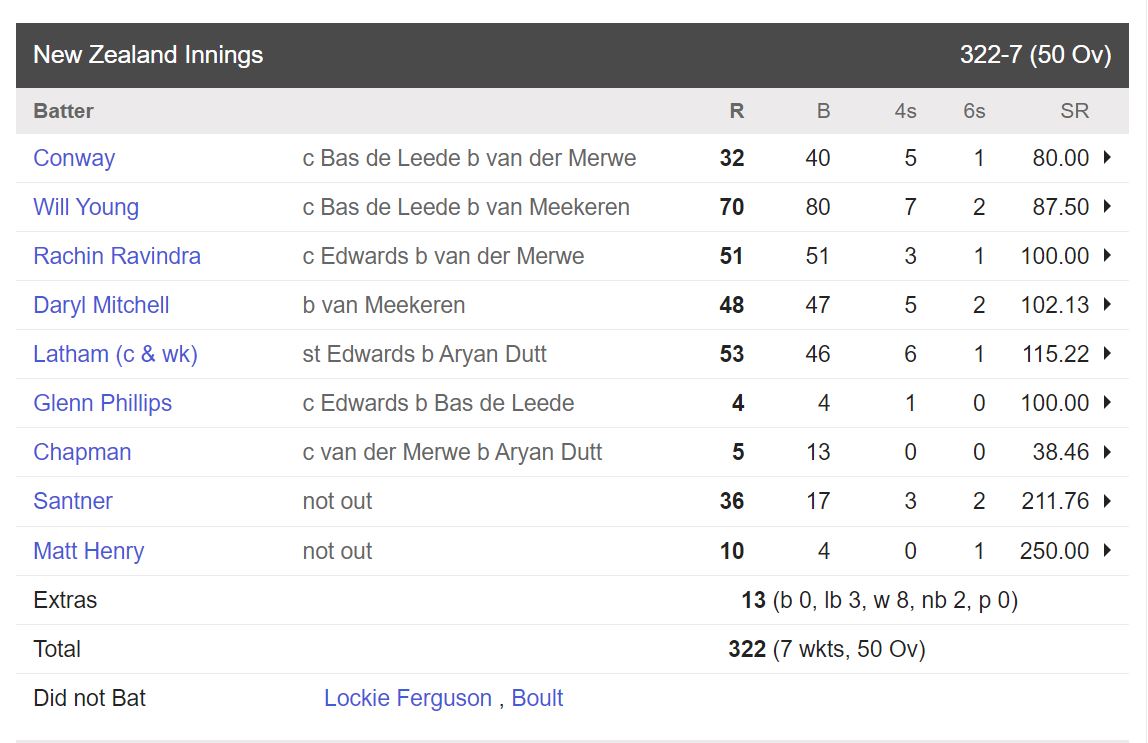 मैच में नीदरलैंड ने टॉस जीतकर पहले गेंदबाजी करने का फैसला किया है। इस दौरान पहले बल्लेबाजी करने उतरी न्यूजीलैंड की टीम ने 50 ओवर में 7 विकेट के नुकसान पर 322 रन बनाए। जवाब में नीदरलैंड 223 रन बनाकर ऑलआउट हो गई।