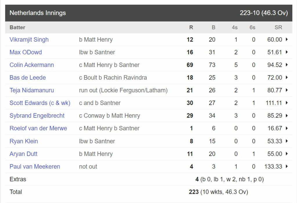 NED vs NZ WorldCup 2023: कमजोर नीदरलैंड पर चढ़ बैठे कीवी गेंदबाज.. डच टीम को 99 रनों के बड़े अंतर से रौंदा, देखें Score Card