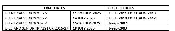 Date of registration of players: जिला क्रिकेट संघ के वर्ष 2026-27 के लिए सभी श्रेणियों के लिए पंजीयन की तिथि 01 जुलाई 2025 से 07 जुलाई 2025 निर्धारित की गई है। पंजीयन का समय आरडीसीए मैदान, तेलीबांधा में सुबह 10.30 बजे से दोपहर 1 बजे तक है।