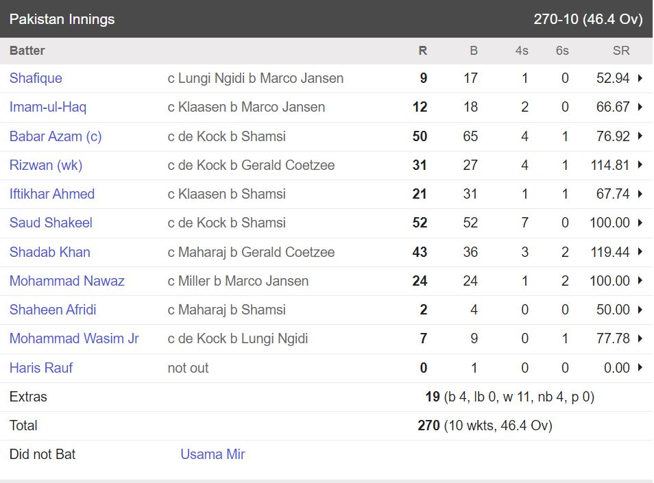 इस मैच में पाकिस्तानी टीम की पारी को लेकर बात की जाए तो वह 46.4 ओवरों में 270 रन बनाकर सिमट गए थे, जिसमें कप्तान बाबर आजम 50 जबकि सऊद शकील के बल्ले से 52 रनों की पारी देखने को मिली। वहीं अफ्रीका के लिए गेंदबाजी में तबरेज शम्सी ने 4 जबकि मार्को यान्सन ने तीन विकेट हासिल किए। पाकिस्तान की इस मैच में हार के साथ अब उनकी सेमीफाइनल में पहुंचने की उम्मीद भी लगभग खत्म हो गई है।