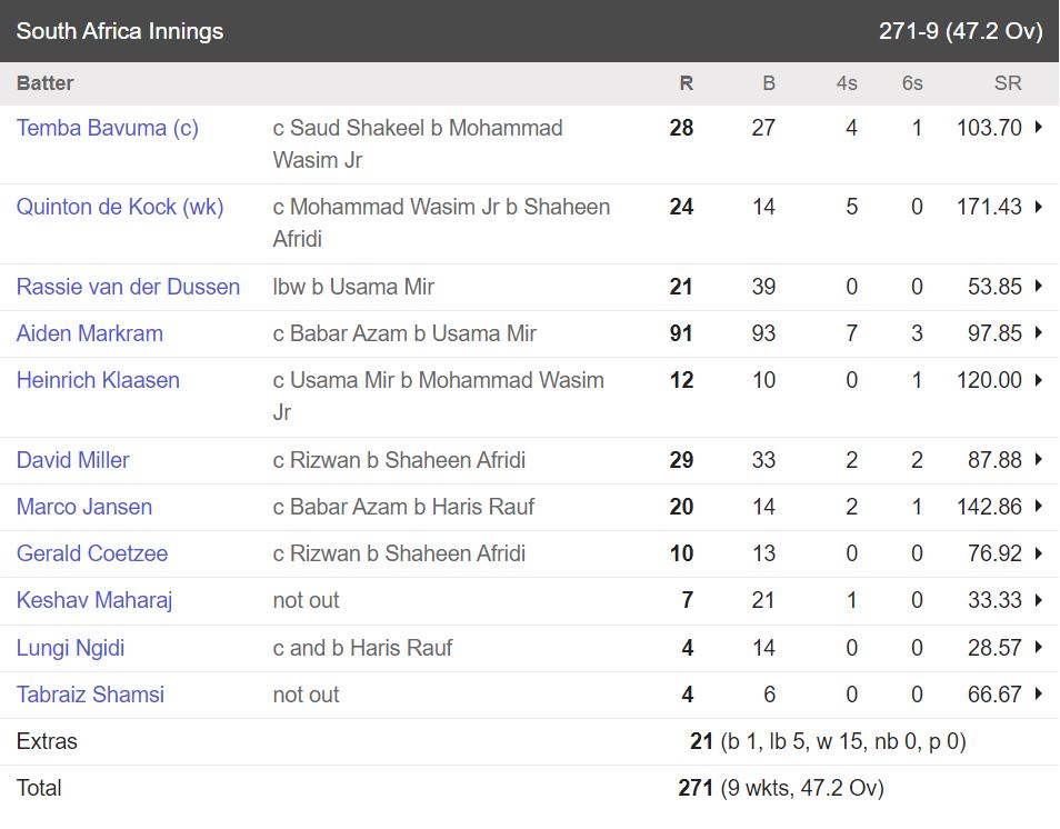 वही 271 रनों के टारगेट का पीछा करने उतरी साउथ अफ्रीकी टीम एक समय 260 के स्कोर तक अपने 9 विकेट गंवा चुकी थी, लेकिन केशव महाराज और तबरेज शम्सी की जोड़ी ने संभलकर खेलते हुए टीम को इस मुकाबले में जीत दिला दी। अफ्रीका के लिए इस मैच में सबसे ज्यादा 91 रनों की पारी एडन मारक्रम के बल्ले से देखने को मिली। साउथ अफ्रीका की यह इस वर्ल्ड कप में पांचवीं जीत है और अब वह प्वाइंट्स टेबल में 10 अंकों के साथ पहले स्थान पर पहुंच गए हैं। पाकिस्तान की टीम से गेंदबाजी में शाहीन अफरीदी ने तीन विकेट हासिल किए तो वहीं हारिस रउफ, मोहम्मद वसीम जूनियर और उस्मा मीर ने 2-2 विकेट लिए।