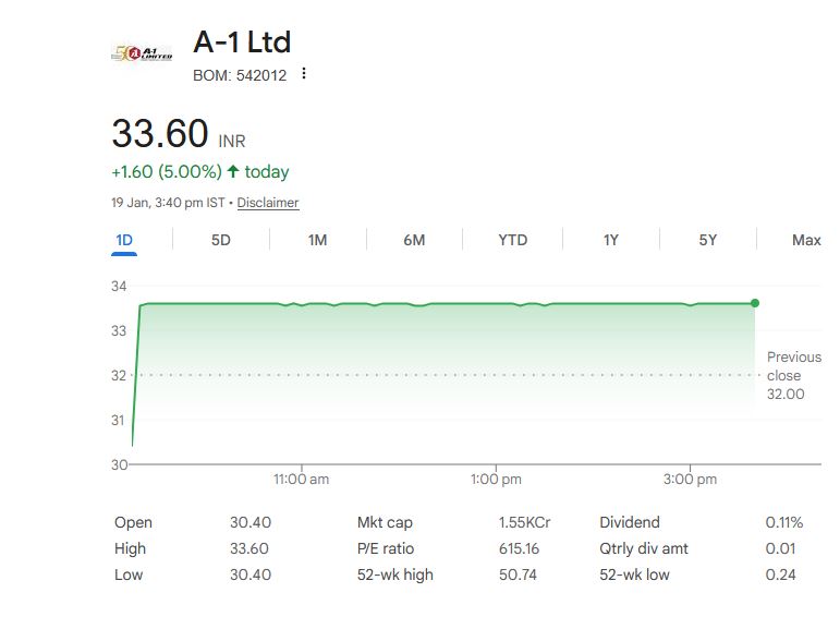 A-1 Ltd Share Price मल्टीबैगर स्टॉक ए-1 लिमिटेड (A-1 Ltd) के शेयरों में आज अपर सर्किट लगा। कंपनी के शेयर बीएसई में 30.40 रुपये के स्तर पर खुले और दिन में 33.60 रुपये के इंट्रा-डे हाई तक पहुंचे, यानी शेयरों में 5 प्रतिशत की तेजी दर्ज हुई। कंपनी ने एक्सचेंज को जानकारी दी कि उसे दो नए वर्क ऑर्डर मिले हैं, जिससे निवेशकों में उत्साह देखने को मिला है।