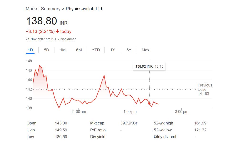PhysicsWallah का शेयर 18 नवंबर को 145 रुपए के इश्यू प्राइस के मुकाबले 33% प्रीमियम पर लिस्ट हुआ था। पहले दिन यह 156.49 रुपये पर बंद हुआ, जो IPO से 44% ऊपर था। लेकिन इसके बाद से स्टॉक लगातार फिसलता जा रहा है।