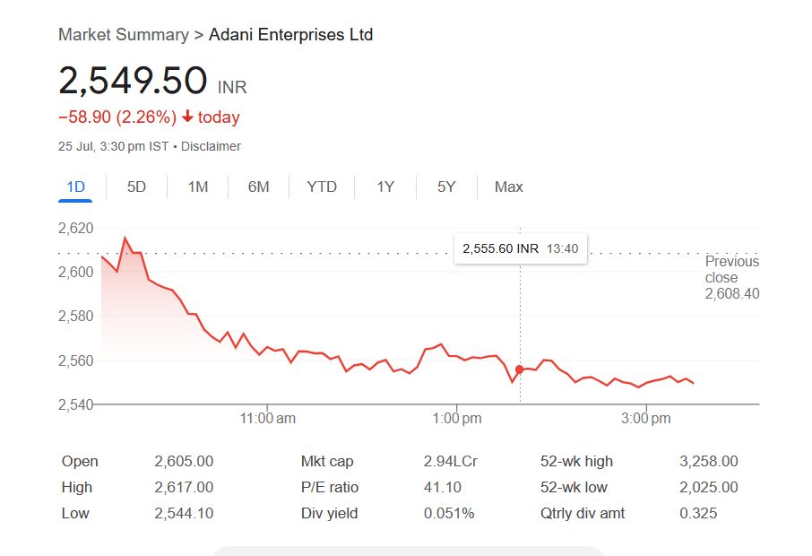 Adani Enterprises Share Price: शुक्रवार, 25 जुलाई 2025 को ग्लोबल मार्केट से मिलेजुले रुझानों के बीच घरेलू इक्विटी सूचकांक बीएसई सेंसेक्स और एनएसई निफ्टी-50 ने गिरावट के साथ शुरुआत की थी। इस बीच अदानी एंटरप्राइजेज लिमिटेड कंपनी के शेयर 2.26 प्रतिशत की गिरावट के साथ 2549.50 रुपये पर कारोबार करते हुए बंद हुआ था। शुक्रवार को ओपनिंग बेल पर ट्रेडिंग शुरू होते ही अदानी एंटरप्राइजेज कंपनी शेयर 2605 रुपये पर खुला था और दोपहर 3.30 बजे तक अदानी एंटरप्राइजेज कंपनी शेयर 2617 रुपये के इंट्रा-डे हाई लेवल तक पहुंचा था। वहीं, शुक्रवार को इस शेयर का लो लेवल 2544.10 रुपये रहा।