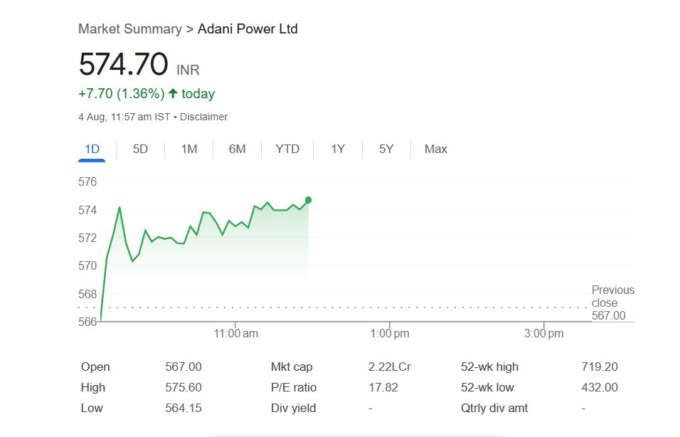 - Adani Power का शेयर आज 1.36% चढ़कर ₹574.70 पर पहुंचा।