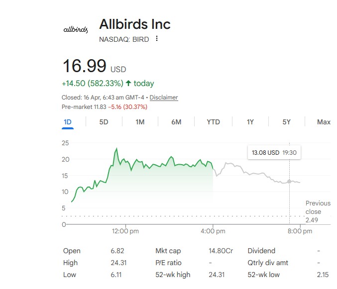 नैस्डैक पर ऑलबर्ड्स का शेयर पिछले बंद भाव 2.49 डॉलर से 174% बढ़कर 6.82 डॉलर पर खुला। दिन के कारोबार में इसमें 876% तक की जोरदार तेजी देखने को मिली और यह 24.31 डॉलर के साथ 52-वीक के नए हाई तक पहुंच गया। अंत में शेयर 16.99 डॉलर पर बंद हुआ, जो 582% से ज्यादा की बढ़त को दर्शाता है। इस उछाल से कंपनी का मार्केट वैल्यूएशन बढ़कर लगभग 147.95 मिलियन डॉलर हो गया, जबकि पहले यह केवल 22 मिलियन डॉलर था।