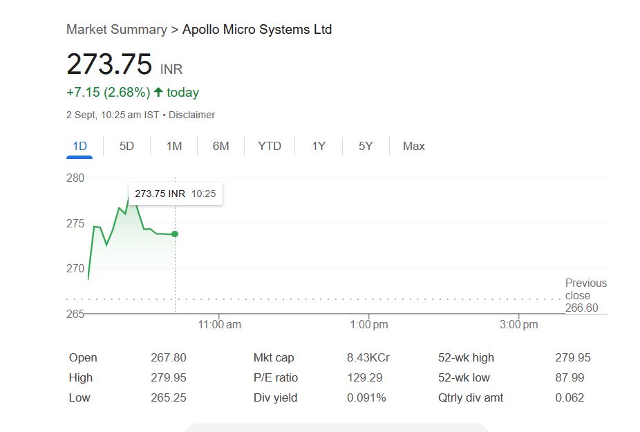 अपोलो माइक्रो सिस्टम्स के शेयरों में बीएसई पर दो दिनों में 13.8% की बढ़ोतरी हुई और मंगलवार, 2 अगस्त को यह 52 सप्ताह के नए उच्चतम स्तर 279.95 रुपये पर पहुंच गया। कंपनी ने रक्षा अनुसंधान एवं विकास संगठन (डीआरडीओ) के साथ नए अनुमोदन और समझौतों की घोषणा की है।