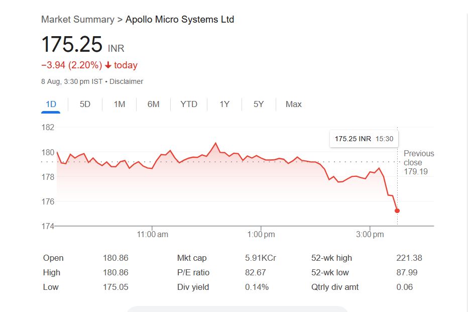 Apollo Micro Systems Share: शुक्रवार, 8 अगस्त को अपोलो माइक्रो सिस्टम्स लिमिटेड कंपनी के स्टॉक में 2.22 प्रतिशत की गिरावट आई और यह शेयर 175.25 रुपये पर बंद हुआ था। नेशनल स्टॉक एक्सचेंज पर उपलब्ध डेटा के मुताबिक, शुक्रवार को ओपनिंग बेल पर ट्रेडिंग शुरू होते ही अपोलो माइक्रो सिस्टम्स कंपनी शेयर 180.86 रुपये पर खुला था और दोपहर 3.30 बजे तक अपोलो माइक्रो सिस्टम्स कंपनी शेयर 180.86 रुपये के दिन के हाई लेवल तक पहुंच गया था। वहीं, इस शेयर का लो लेवल 175.05 रुपये था 87.26