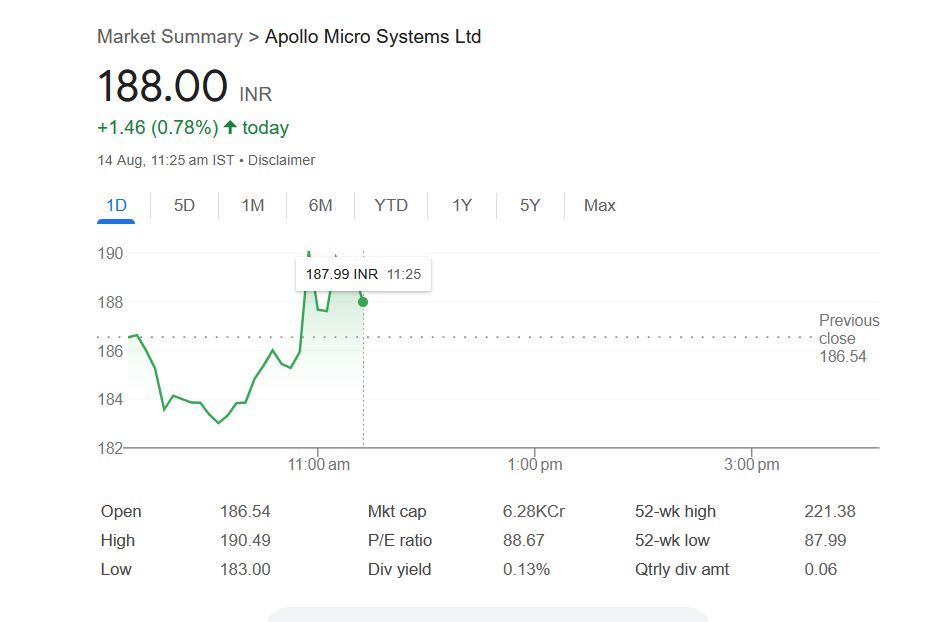 गुरुवार, 14 अगस्त 2025 तक अपोलो माइक्रो सिस्टम्स लिमिटेड कंपनी शेयर का 52 सप्ताह का उच्च स्तर 221.38 रुपये था। वहीं, इस शेयर का 52 सप्ताह का निचला स्तर 87.99 रुपये था। यह स्टॉक अपने 52 सप्ताह के उच्च स्तर से -15.99% की गिरावट के साथ ट्रेड कर रहा है वहीं, 52 सप्ताह के निचले स्तर से 111.36% ऊपर कारोबार कर रहा है। पिछले 30 दिनों के दौरान अपोलो माइक्रो सिस्टम्स कंपनी में प्रतिदिन औसतन 49,76,875 शेयरों का कारोबार हुआ। आज कंपनी का कुल मार्केट कैप बढ़कर 6,280 करोड़ रुपये है और कंपनी का P/E रेशियो 88.67 है। वहीं, अपोलो माइक्रो सिस्टम्स कंपनी पर कुल 295 करोड़ रुपये का कर्ज है।