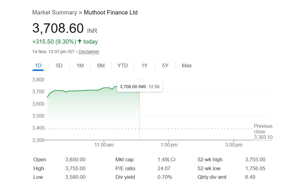 Muthoot Finance Share Price: आज मुथूट फाइनेंस के शेयरों में तेज उछाल देखा गया है। सितंबर 2025 तिमाही के शानदार नतीजों, खासकर मुनाफे के करीब दोगुना होने के बाद शेयर शुक्रवार को 10% से ज्यादा चढ़कर 3755 रुपये के रिकॉर्ड स्तर पर पहुंच गए। इससे कंपनी ने अपना नया 52 हफ्ते का हाई भी बनाया है।