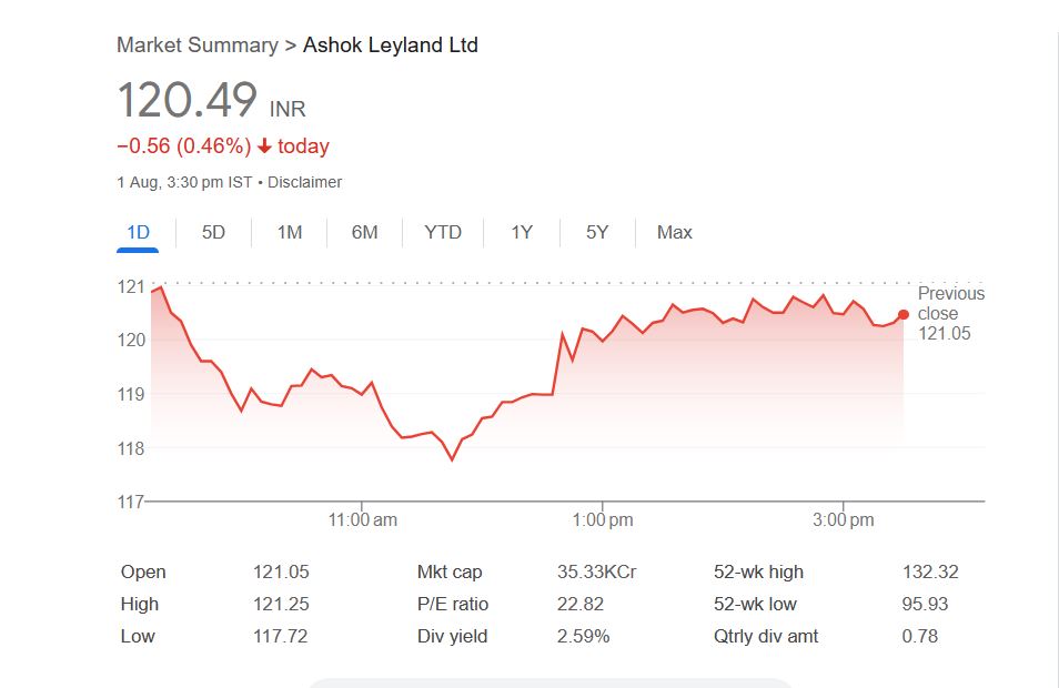 Ashok Leyland Share Price: शुक्रवार, 1 अगस्त को अशोक लेलैंड लिमिटेड कंपनी के शेयर में 0.46 प्रतिशत की गिरावट आई और यह शेयर 120.49 रुपये पर कारोबार करते हुए बंद हुआ था। शुक्रवार, को ओपनिंग बेल पर ट्रेडिंग शुरू होते ही अशोक लेलैंड कंपनी शेयर 121.05 रुपये पर ओपन हुआ था और दोपहर 3.30 बजे तक अशोक लेलैंड कंपनी शेयर 121.25 रुपये के इंट्रा-डे हाई लेवल तक पहुंच गया था। वहीं, शुक्रवार को इस शेयर का लो लेवल 117.72 रुपये था।