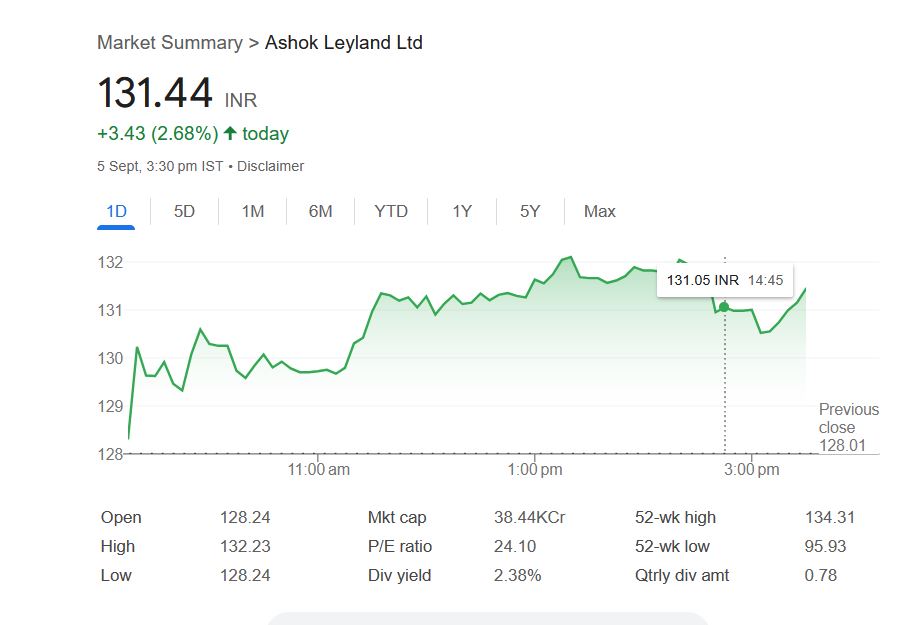 शुक्रवार, 5 सितंबर 2025 के दिन सेंसेक्स-निफ्टी में उतार-चढ़ाव के बीच अशोक लेलैंड लिमिटेड कंपनी का शेयर 131.44 रुपये पर कारोबार कर रहा है। पिछला क्लोजिंग प्राइस 128.01 रुपये के स्तर से शेयर 2.68 प्रतिशत की उछाल के साथ ट्रेड कर रहा है। शुक्रवार को सुबह स्टॉक मार्केट में ट्रेडिंग शुरू होते ही अशोक लेलैंड शेयर 128.24 रुपये पर खुला था। जो आज दोपहर 3.30 बजे तक अशोक लेलैंड कंपनी शेयर ने दिन का 132.23 रुपये के इंट्रा-डे हाई लेवल को छुआ। वहीं, शुक्रवार को शेयर का लो-लेवल 128.24 रुपये था।