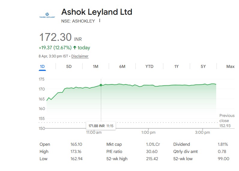 Ashok Leyland Share Price: अशोक लेलैंड का शेयर बुधवार को 13.2% बढ़कर 173.16 रुपये के इंट्राडे हाई पर पहुंच गया। यह अभी अपने 52 सप्ताह के हाई 215.42 रुपये से लगभग 25% दूर है। लगातार तेजी से निवेशकों में उत्साह बढ़ गया है। (NSE: ASHOKLEY, BSE: 500477)