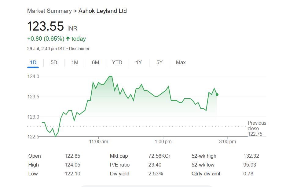 Ashok Leyland Share Price: आज, मंगलवार, 29 जुलाई 2025 के दिन अशोक लेलैंड लिमिटेड कंपनी का शेयर 0.65% उछलकर 123.55 रुपये पर कारोबार कर रहा है। आज सुबह शेयर बाजार में ट्रेडिंग शुरू होते ही अशोक लेलैंड शेयर 122.85 रुपये पर ओपन हुआ था। जो आज दोपहर 2.40 बजे तक अशोक लेलैंड कंपनी शेयर का इंट्रा डे हाई-लेवल 124.05 रुपये और लो-लेवल 122.10 रुपये रहा।