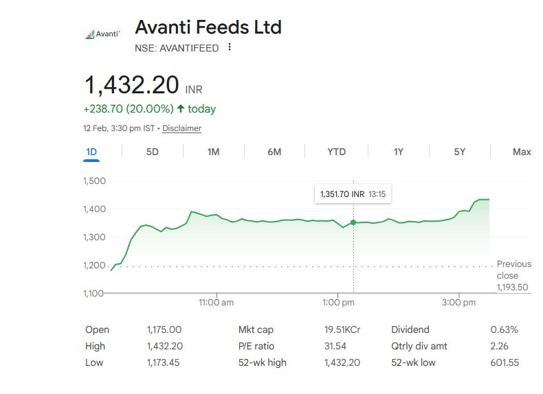 Avanti Feeds Share Price: झींगा (श्रिम्प) कारोबार में सक्रिय अवंति फीड्स के शेयरों में जबरदस्त तेजी का दौर लगातार चौथे दिन भी जारी रही। 12 फरवरी को गुरुवार को यह शेयर 20% बढ़कर 1,432.20 रुपये पर पहुंच गया, जो अब तक का सबसे ऊंचा स्तर है। जबकि अधिकांश व्यापक बाजार सीमित दायरे में कारोबार कर रहे थे, अवंति फीड्स निवेशकों की खास पसंद बना हुआ था। हाल की सकारात्मक खबरों और बेहतर तिमाही नतीजों के कारण शेयर में भारी खरीदारी देखने को मिली है, जिससे बुल रन जारी है।