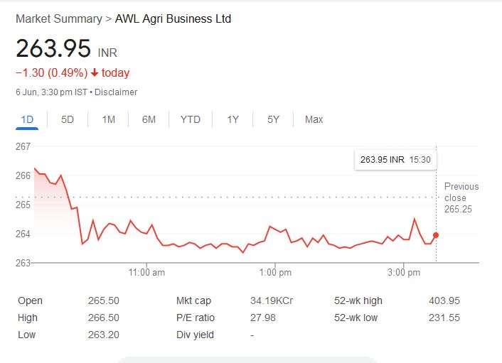 हालांकि शुक्रवार को AWL Agri Business Ltd के शेयरों में हल्की गिरावट देखने को मिली। यह शेयर 265.50 रुपये पर खुला और दिन में 266.50 रुपये का उच्चतम स्तर छुआ, लेकिन अंत में -0.49% की गिरावट के साथ 263.95 रुपये पर बंद हुआ। इस दिन इसका लो लेवल 263.20 रुपये रहा। कंपनी का 52 हफ्ते का हाई 403.95 रुपये और लो 231.55 रुपये रहा है। मौजूदा मार्केट कैप 34,190 करोड़ रुपये है।