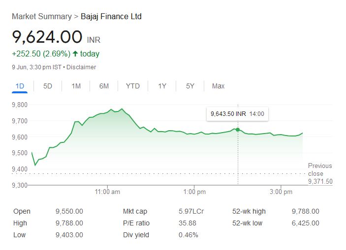 बाजार की शुरुआत के साथ ही बजाज फाइनेंस लिमिटेड के शेयरों में भी जबरदस्त तेजी देखी गई। यह शेयर दिन के अंत में 2.69% की मजबूती के साथ 9,624.00 रुपये पर बंद हुआ। ट्रेडिंग के दौरान इसने 9,788 रुपये का उच्चतम और 9,403 रुपये के न्यूनतम स्तर को छू लिया। दिन की शुरुआत 9,550 रुपये पर हुई थी।