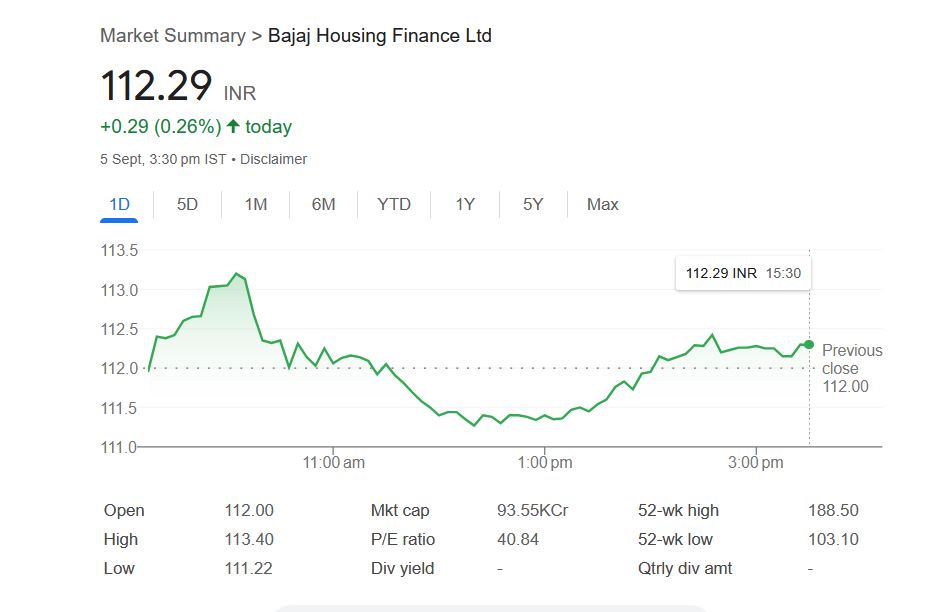 आज, शुक्रवार, 5 सितंबर 2025 के दिन बजाज हाउसिंग फाइनेंस लिमिटेड कंपनी का शेयर 0.25 प्रतिशत के तेजी के साथ 112.29 रुपये पर बंद हुआ। आज सुबह शेयर बाजार में ट्रेडिंग शुरू होते ही बजाज हाउसिंग फाइनेंस शेयर 112 रुपये पर ओपन हुआ था। जो आज दोपहर 3.30 बजे तक बजाज हाउसिंग फाइनेंस कंपनी शेयर का इंट्रा-डे हाई-लेवल 113.40 रुपये और लो-लेवल 111.22 रुपये था।
