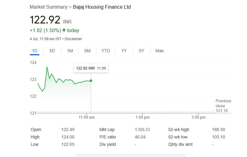 Bajaj Housing Finance Share Price: शुक्रवार, 4 जुलाई 2025 के दिन सेंसेक्स-निफ्टी उतार-चढ़ाव के बीच बजाज हाउसिंग फाइनेंस लिमिटेड कंपनी का शेयर122.92 रुपये पर कारोबार कर रहा हैं। पिछले बंद मूल्य 121.10 रुपये के स्तर से शेयर 1.50% की तेजी के साथ कारोबार कर रहा हैं। शुक्रवार को सुबह शेयर मार्केट में ट्रेडिंग शुरू होते ही बजाज हाउसिंग फाइनेंस शेयर 122.49 रुपये पर खुला था। आज सुबह 11:09 AM तक बजाज हाउसिंग फाइनेंस कंपनी के शेयर ने दिन के 124 रुपये के हाई लेवल को छुआ। वहीं, इसका लो-लेवल 122.05 रुपये था। बजाज फाइनेंस कंपनी के शेयर का 52 सप्ताह का उच्चतम स्तर 188.50 रुपये और न्यूनतम स्तर 103.10 रुपये है। इस दौरान कंपनी का कुल मार्केट कैप बढ़कर 1,02,446 करोड़ रुपये हो गया।