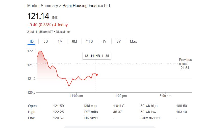 Bajaj Housing Finance Share Price: आज, बुधवार, 2 जुलाई 2025 के दिन सुबह 11:55 AM तक, बजाज हाउसिंग फाइनेंस लिमिटेड कंपनी का शेयर -0.33% फिसलकर 121.14 रुपये पर कारोबार कर रहा है। बुधवार को सुबह शेयर बाजार में ट्रेडिंग शुरू होते ही बजाज हाउसिंग फाइनेंस शेयर 121.54 रुपये पर खुला था। जो आज 11:55 AM तक कंपनी शेयर का हाई-लेवल 122.25 रुपये और लो-लेवल 120.67 रुपये था।