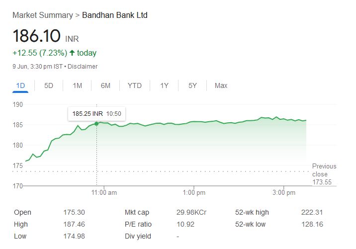 तेजी के इस माहौल में बंधन बैंक लिमिटेड के शेयरों ने दमदार प्रदर्शन किया। कंपनी का शेयर सोमवार को 7.23% की शानदार तेजी के साथ 186.10 रुपये पर बंद हुआ। कारोबार की शुरुआत 175.30 रुपये पर हुई थी और दिनभर के कारोबार में यह शेयर 187.46 रुपये के ऊपरी स्तर तक गया, वहीं इसका निचला स्तर 174.98 रुपये रहा।
