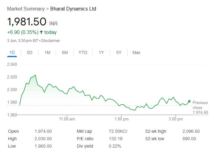 - BDL शेयर 0.35% की बढ़त के साथ 1,981.50 रुपये पर बंद।