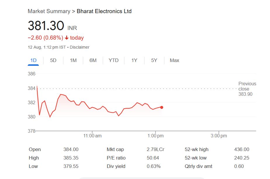 मंगलवार, 12 अगस्त 2025 के दिन भारत इलेक्ट्रॉनिक्स लिमिटेड कंपनी का स्टॉक 0.68 प्रतिशत की हल्की गिरावट के साथ 381.30 रुपये पर कारोबार कर रहा है। आज सुबह शेयर मार्केट में ट्रेडिंग शुरू होते ही भारत इलेक्ट्रॉनिक्स के शेयर 384 रुपये पर खुला था। आज दोपहर 1:12 बजे तक भारत इलेक्ट्रॉनिक्स कंपनी शेयर ने 385.35 रुपये के इंट्रा डे हाई लेवल को टच किया। वहीं, इस दौरान शेयर का लो-लेवल 379.55 रुपये रहा।
