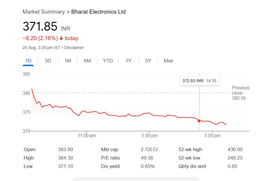 BEL Share Price: आज बुधवार, 20 अगस्त 2025 को सेंसेक्स और निफ्टी में उतार-चढ़ाव के बीच भारत इलेक्ट्रॉनिक्स लिमिटेड कंपनी का शेयर 2.16% गिरावट के साथ 371.85 रुपये पर कारोबार कर रहा है। आज सुबह शेयर बाजार में ट्रेडिंग शुरू होते ही भारत इलेक्ट्रॉनिक्स शेयर 383.90 रुपये पर खुला था। जो आज दोपहर 3.28 बजे तक भारत इलेक्ट्रॉनिक्स कंपनी शेयर का इंट्रा-डे हाई-लेवल 384.30 रुपये और लो-लेवल 371.10 रुपये था।