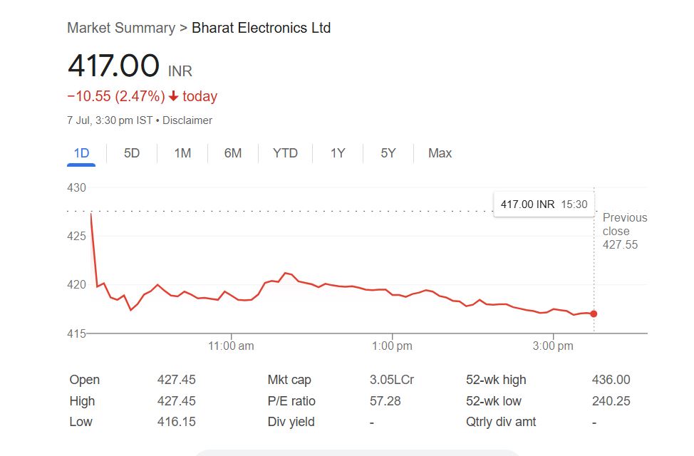 - BEL का स्टॉक -2.47% गिरकर 417 रुपये पर बंद हुआ।