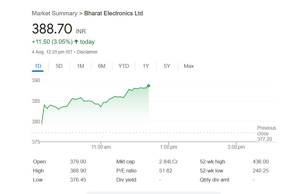BEL Share Price: सोमवार, 4 अगस्त 2025 के दिन सेंसेक्स-निफ्टी में उतार-चढ़ाव के बीच भारत इलेक्ट्रॉनिक्स लिमिटेड कंपनी का शेयर 388.70 रुपये पर कारोबार कर रहा हैं। पिछला क्लोजिंग प्राइस 377.20 रुपये के स्तर से शेयर 3.05% की तेजी के साथ ट्रेड कर रहा है। सोमवार को सुबह शेयर मार्केट में ट्रेडिंग शुरू होते ही भारत इलेक्ट्रॉनिक्स शेयर 379 रुपये पर खुला था। जो आज दोपहर 12.25 बजे तक भारत इलेक्ट्रॉनिक्स कंपनी शेयर ने 388.90 रुपये के इंट्रा-डे हाई लेवल को छुआ। वहीं, सोमवार को शेयर का लो-लेवल 376.45 रुपये था।
