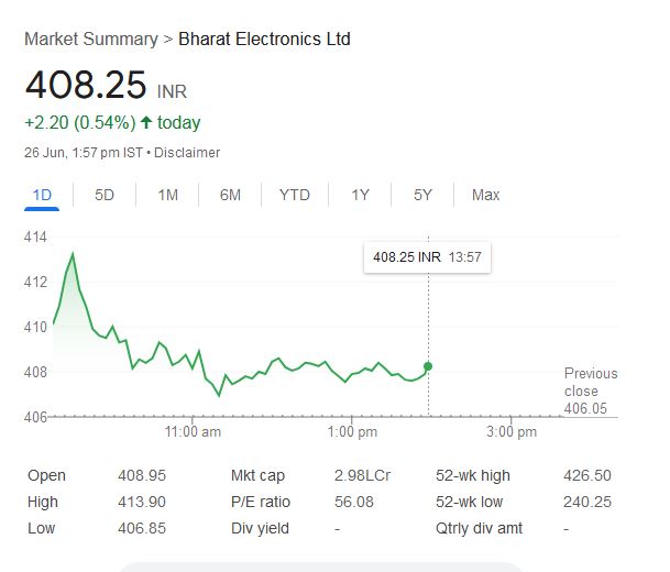 आज गुरुवार, 26 जून 2025 दोपहर 1:57 बजे तक भारत इलेक्ट्रॉनिक्स लिमिटेड कंपनी शेयर का 52-सप्ताह का उच्चतम स्तर 426.50 रुपये और निचला स्तर 240.25 रुपये है। इस दौरान कंपनी का मार्केट कैप बढ़कर 2.98 लाख करोड़ रुपये हो गया। वहीं, कंपनी का वर्तमान P/E रेशियो 56.08 है।