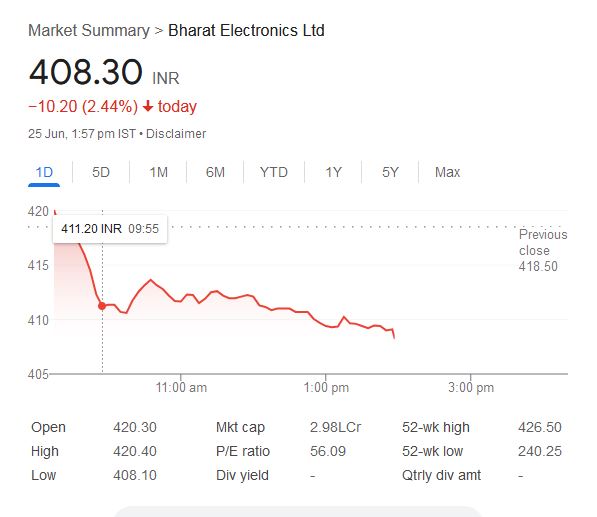 BEL Share Price: बुधवार, 25 जून 2025 को भारत इलेक्ट्रॉनिक्स लिमिटेड (BEL) कंपनी का स्टॉक 2.44% की गिरावट के साथ 408.30 रुपये पर कारोबार कर रहा हैं। आज सुबह स्टॉक मार्केट में ट्रेडिंग शुरू होते ही BEL शेयर 420.30 रुपये पर खुला था। आज दोपहर 1.57 PM तक भारत इलेक्ट्रॉनिक्स कंपनी शेयर ने दिन का 420.40 रुपये का हाई लेवल छुआ। जबकि शेयर का लो-लेवल 408.10 रुपये था।