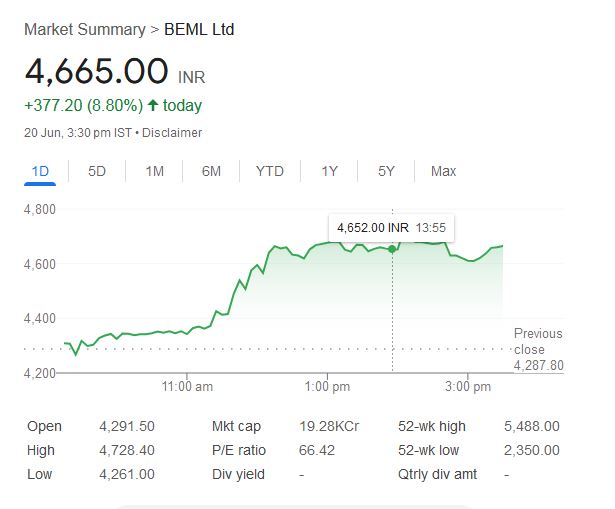 BEML Share Price: शुक्रवार, 20 जून 2025 को मिनीरत्न कंपनी BEML लिमिटेड के शेयरों में जबरदस्त तेजी देखने को मिली है। कंपनी के स्टॉक्स BSE पर 9% से ज्यादा की छलांग लगाते हुए 4,728.40 रुपये के स्तर पर पहुंच गए। सिर्फ एक महीने में इस सरकारी कंपनी के शेयरों में 32% से ज्यादा की तेजी दर्ज की गई है। तीन महीने पहले यानी 20 मार्च 2025 तक जिस शेयर की कीमत 2,744.85 रुपये थी, वह अब इंट्रा-डे हाई 4,728.40 रुपये को छू चुका है। यानी इस अवधि में BEML ने 72% से ज्यादा का रिटर्न दिया है।