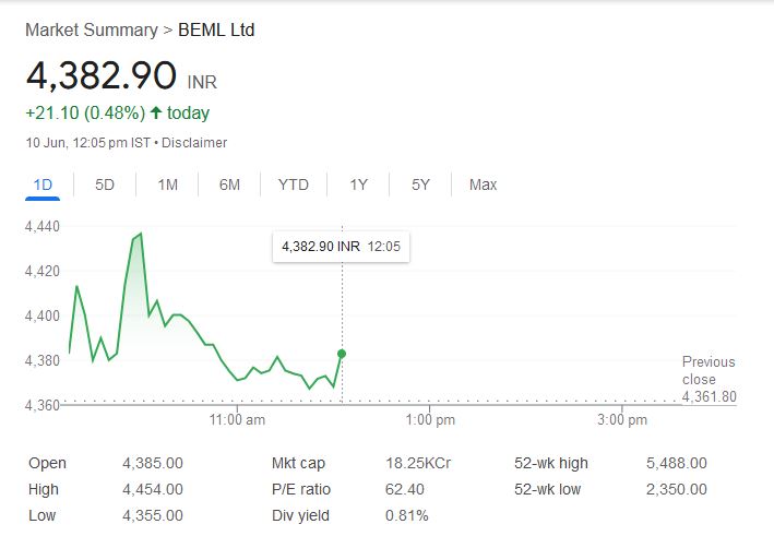 BEML Share Price: मंगलवार, 10 जून 2025 को मिनीरत्न कंपनी बीईएमएल (BEML) के शेयरों में जबरदस्त उछाल देखने को मिली है। आज यह स्टॉक करीब 12:00 बजे तक 4,382.90 रुपये के स्तर पर कारोबार कर रहे हैं। पिछले एक महीने में शेयर में 37% से अधिक की तेजी आई है। यह तेजी तब देखने को मिली जब कंपनी ने डिफेंस रिसर्च एंड डेवलपमेंट ऑर्गेनाइजेशन (DRDO) के साथ तीन अहम लाइसेंसिंग समझौतों पर हस्ताक्षर किए हैं।