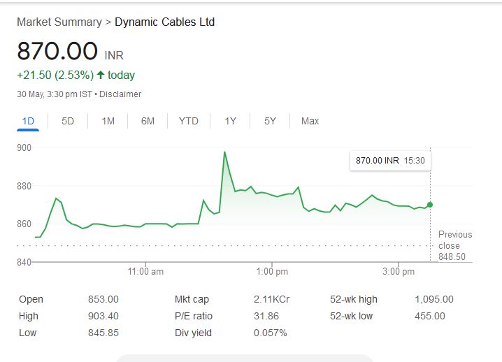 शुक्रवार को डायनेमिक केबल्स के शेयरों ने इंट्राडे में 903.40 रुपये के स्तर को छू लिया था। बाजार बंद होने तक यह स्टॉक 2.52% की तेजी के साथ 870 रुपये पर बंद हुआ। पिछले एक महीने में शेयर ने 61% की शानदार छलांग लगाई है। हालांकि, सालाना आधार पर यह रिटर्न 55.96% के करीब रहा है।