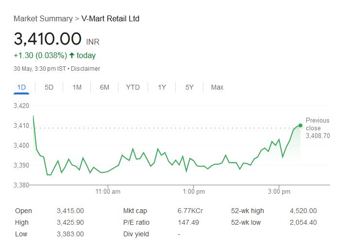 शुक्रवार को वी-मार्ट के शेयर 0.038% की मामूली बढ़त के साथ 3,410 रुपये पर बंद हुए। बीते तीन महीनों में इस स्टॉक ने 14% से ज्यादा का रिटर्न दिया है, जबकि एक साल की अवधि में यह रिटर्न 61% से अधिक रहा है। वहीं, सेंसेक्स इस दौरान करीब 10% ही ऊपर चढ़ पाया है। वहीं, कंपनी का 52-सप्ताह का उच्चतम स्तर 4,520 रुपये और न्यूनतम स्तर 2,054.40 रुपये रहा है। शुक्रवार को कंपनी का मार्केट कैप बढ़कर 6,770 करोड़ रुपये हो गया। बीते 10 वर्षों में इस स्टॉक ने लगभग 582% का रिटर्न दिया है, जो कि सेंसेक्स की 192.69% की बढ़त से कहीं ज्यादा है।