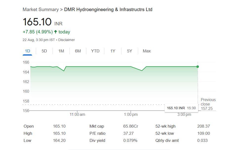 शुक्रवार, 22 अगस्त को डीएमआर हाइड्रोइंजीनियरिंग एंड इंफ्रास्ट्रक्चर लिमिटेड के शेयरों में अपर सर्किट लग गया और यह बीएसई पर 165.10 रुपये के स्तर पर बंद हुआ। कंपनी का 52 सप्ताह का उच्चतम स्तर 208.37 रुपये, जबकि न्यूनतम स्तर 109 रुपये रहा है। कंपनी का कुल मार्केट कैप 65.86 करोड़ रुपये है। सबसे खास बात यह है कि पिछले 3 साल में इस स्टॉक ने 636% तक का शानदार रिटर्न दिया है। हाल ही में कंपनी ने एक शेयर पर 13 पैसे का डिविडेंड भी घोषित किया था।