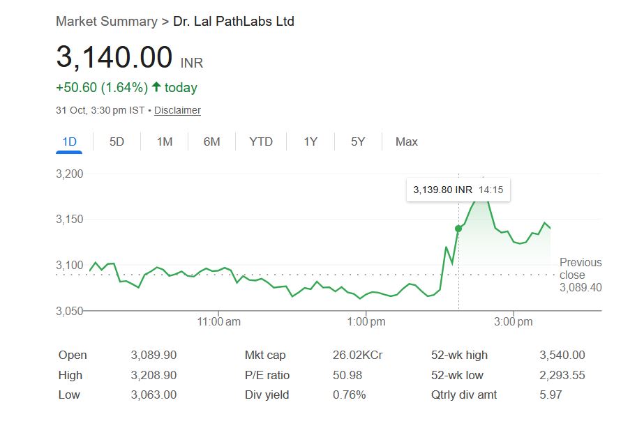 शुक्रवार को बीएसई में डॉ लाल पैथलैब्स के शेयर 1.64 प्रतिशत की तेजी के साथ 3,140.00 रुपये पर बंद हुए। पिछले 6 महीनों में स्टॉक में 13.36 प्रतिशत की वृद्धि देखी गई है। हालांकि, एक साल के आधार पर शेयर ने केवल 0.80 प्रतिशत का रिटर्न दिया।