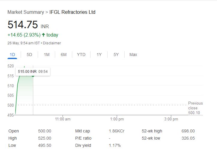 Bonus Share: अपने शेयरधारकों के लिए IFGL Refractories ने बड़ी खुशखबरी दी है। कंपनी ने पहली बार बोनस शेयर जारी करने और फाइनल डिविडेंड देने का निर्णय लिया है। कंपनी ने इस फैसले की जानकारी शनिवार को स्टॉक एक्सचेंज को दी गई। पिछले दो हफ्तों में इस कंपनी के शेयरों में 35% से ज्यादा की उछाल भी देखने को मिली है।