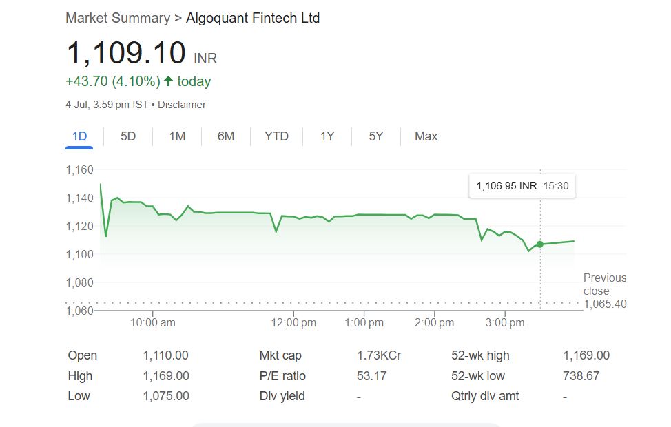 एल्गोक्वांट फिनटेक लिमिटेड कंपनी का स्टॉक बीते वर्षों में मल्टीबैगर साबित हुआ है। 4 जुलाई को यह शेयर बीएसई पर 1109.10 रुपये पर बंद हुआ। कंपनी का कुल मार्केट कैप 1,730 करोड़ रुपये है। बीते 5 सालों में एल्गोक्वांट फिनटेक के शेयर ने 10,323% से अधिक रिटर्न दिया है। वहीं, 10 साल का रिटर्न करीब 23,600% रहा है। बीते 2 साल में 190% की उछाल देखी गई है। अगर पिछले 1 साल की बात की जाए तो इसमें 39.91% की तेजी आई है। जबकि 3 महीनों में 26% और 1 सप्ताह में 9.62% की बढ़ोतरी दर्ज की गई है।