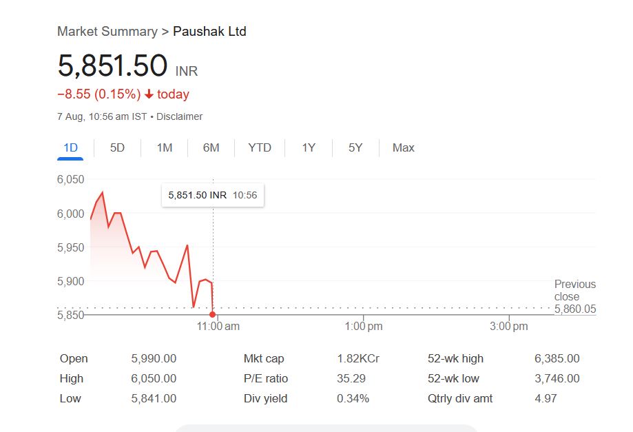 - Paushak के शेयर में 10% की तेजी, 5,860 रुपये पर पहुंचा।