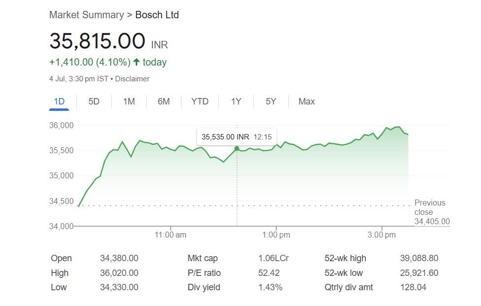शुक्रवार, 4 जुलाई 2025 को Bosch Limited के शेयर में जबरदस्त तेजी देखी गई और यह 4.10% उछलकर 35,815 रुपये पर बंद हुआ। बॉश लिमिटेड कंपनी के शेयर में इस जबरदस्त तेजी ने निवेशकों का ध्यान अपनी तरफ खींच लिया है, विशेष रूप से डिविडेंड की बड़ी घोषणा के बाद।
