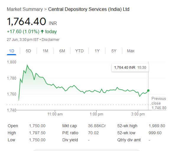 शुक्रवार, 27 जून 2025 तक CDSL कंपनी शेयर का 52 हफ्ते का हाई लेवल 1989.80 रुपये था. जबकि, शेयर का 52 सप्ताह का निचला स्तर 999.60 रुपये था। इस दौरान कंपनी का कुल मार्केट कैप बढ़कर 36,880 करोड़ रुपये हो गया। इसका वर्तमान P/E रेशियो 70.02 है।