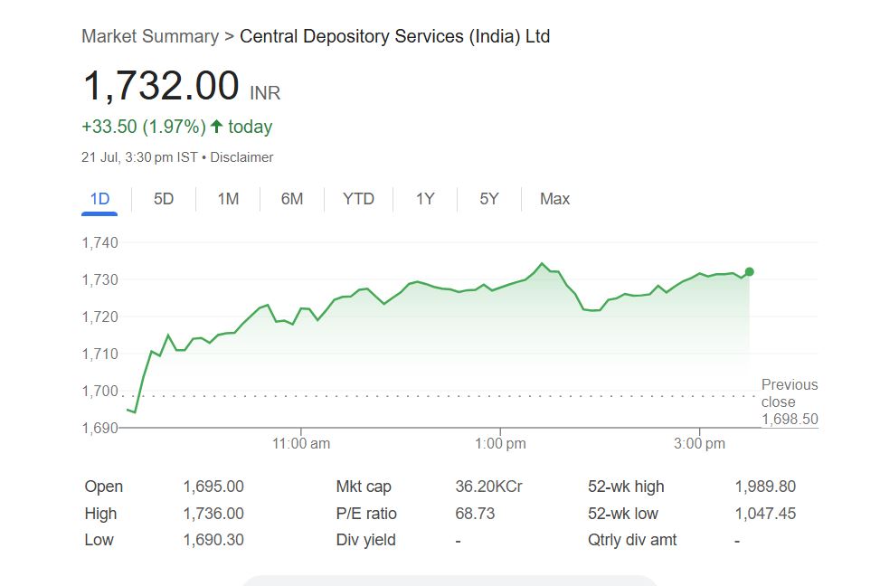- CDSL का शेयर आज 1.97% की तेजी के साथ ₹1732 पर बंद हुआ।